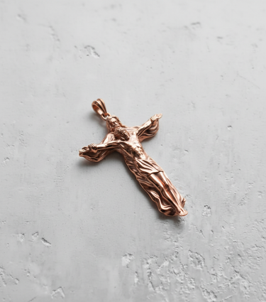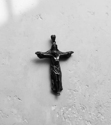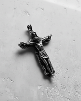 Front view of handcrafted silver crucifix pendant showing detailed relief and oxidized finish Front view of handcrafted silver crucifix pendant showing detailed relief and oxidized finish