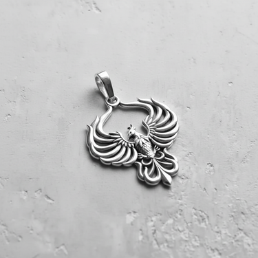 Ignite your spirit with the legendary symbolism of this handcrafted Silver Phoenix Pendant. Meticulously cast from premium 925 sterling silver, this striking piece captures the mythical firebird in a moment of majestic ascent, featuring symmetrical wings that curve elegantly to create a unique, open silhouette. The intricate detailing on the ornate tail feathers and the bird's proud profile highlights superior craftsmanship, showcasing the depth and texture of the metal. Whether chosen in the radiant rose gold plated finish or classic silver, this silver phoenix pendant represents rebirth, renewal, and resilience. Perfect for mythology enthusiasts or as a meaningful gift for someone starting a new chapter, this pendant combines durability with timeless elegance. Wear this silver phoenix pendant as a daily reminder of your inner strength and the ability to rise above any challenge.