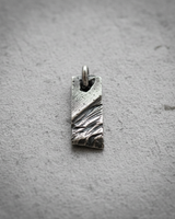Front view of rectangular silver pendant showing deep grooves and weathered surface details on light background Front view of rectangular silver pendant showing deep grooves and weathered surface details on light background