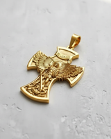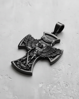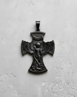Front view of 925 sterling silver St. Michael cross pendant with oxidized finish and detailed relief