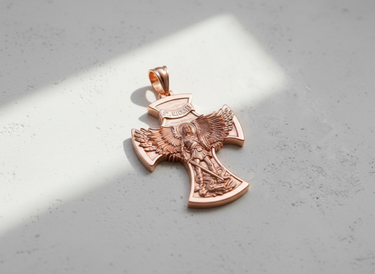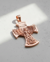 Rose gold plated Silver St. Michael Pendant featuring winged archangel defeating a dragon on grey background Rose gold plated Silver St. Michael Pendant featuring winged archangel defeating a dragon on grey background