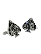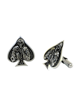 Play your final hand with these mesmerizing Death Ace cufflinks, expertly crafted in premium 925 sterling silver. Each spade-shaped piece features the Grim Reaper as a skeletal gambler, clutching playing cards in bony fingers while seated at fate's table. The iconic ace of spades symbol frames this macabre scene, creating a powerful fusion of casino culture and mortality symbolism. The oxidized black background enhances every haunting detail, from the reaper's hooded cloak to the scattered cards that represent life's ultimate gamble. Perfect for poker enthusiasts, gothic fashion lovers, or those who appreciate dark symbolism with a twist. These statement cufflinks transform formal wear into a bold declaration that in life's game, death always holds the winning hand.