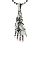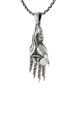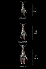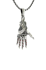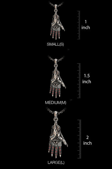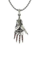 Discover the fusion of organic and mechanical artistry with this extraordinary biomechanical hand pendant, meticulously crafted in authentic 925 sterling silver. This stunning piece captures the intricate beauty of cybernetic enhancement, featuring anatomically detailed fingers adorned with crimson gemstone accents that evoke energy nodes or technological power sources. The sophisticated design showcases seamless integration between polished metallic surfaces and darkened mechanical joints, creating a striking visual contrast. Flowing tribal patterns and gear-inspired engravings add depth and character to each segment. Perfect for fans of cyberpunk aesthetics, science fiction enthusiasts, and those who appreciate avant-garde jewelry design. This substantial pendant makes a powerful statement about the intersection of humanity and technology.