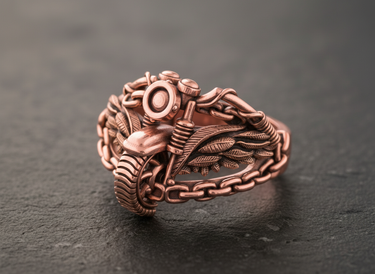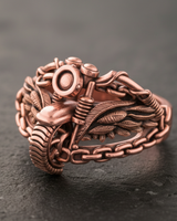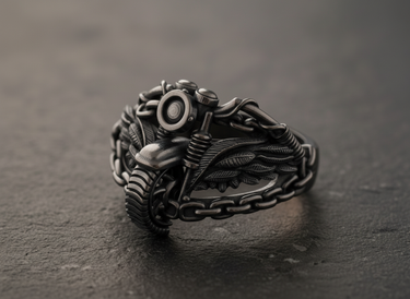 Rev up your style with this dynamic 925 sterling silver biker motorcycle ring. Expertly handcrafted for the open road enthusiast, this piece features a highly detailed front view of a classic chopper, complete with handlebars, suspension springs, and a textured tire. Flanking the motorcycle centerpiece are intricate eagle wings symbolizing freedom, while the sturdy band is constructed from realistic bike chain links for a rugged, authentic aesthetic. The oxidized finish adds depth to the metallic design, highlighting the mechanical precision and artisanal craftsmanship. Made from premium solid silver, this durable accessory is built to withstand the ride of life. An ideal gift for riders and motorcycle lovers, this statement ring captures the spirit of the road in a bold, wearable piece of art that commands attention wherever you go.