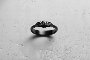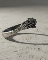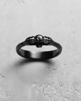 Side profile of silver gothic ring showing skeletal arm band details and oxidized finish for depth Side profile of silver gothic ring showing skeletal arm band details and oxidized finish for depth