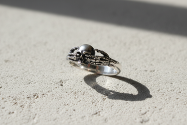 Front close-up of silver skull ring with skeleton hands design showcasing intricate metalwork details Front close-up of silver skull ring with skeleton hands design showcasing intricate metalwork details