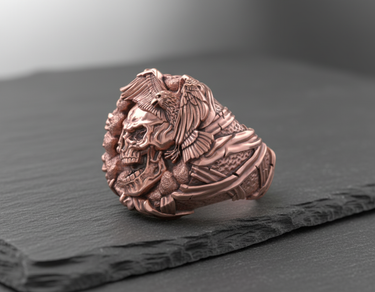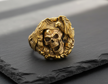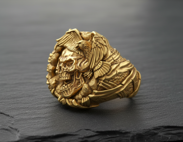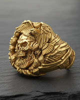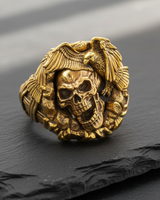 Unleash a bold statement of freedom and mortality with this handcrafted Silver Eagle Skull Ring. Meticulously designed by expert artisans, this piece features a striking profile of a grinning skull surmounted by a majestic eagle, symbolizing the eternal cycle of life and power. Cast in premium 925 sterling silver, the ring showcases exceptional detail, from the intricate feathering of the bird's wings to the hollows of the skull's visage, enhanced by a dark oxidized finish and contrasting gold-tone accents. This durable biker-style ring offers a comfortable fit and a rugged aesthetic perfect for the modern rebel or gothic enthusiast. Whether you represent the spirit of the open road or simply appreciate unique jewelry, this silver eagle skull ring serves as a commanding accessory for any occasion. Elevate your collection with this masterpiece that blends masterful craftsmanship with fearless symbolism.