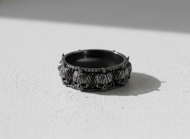 Celebrate the spirit of the macabre with this captivating silver pumpkin skull ring, a perfect blend of gothic charm and artisanal mastery. Meticulously handcrafted from high-quality 925 sterling silver, this continuous band features a procession of grinning jack-o'-lantern skulls, each detailed with twisted stems and hollow, haunting eyes. The design is framed by intricate beaded edges that add texture and a refined finish to the piece. Expertly oxidized to enhance the depth of the carving, the dark recesses contrast beautifully with the polished silver highlights. This silver pumpkin skull ring is more than just jewelry; it is a bold statement piece designed for Halloween enthusiasts and bikers alike. Durable and comfortable for everyday wear, it makes an exceptional gift for those who appreciate unique, dark aesthetics. Elevate your accessory collection with this striking example of fine silver craftsmanship that embodies both mystery and style.