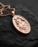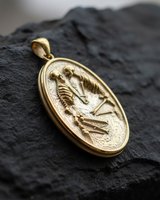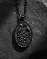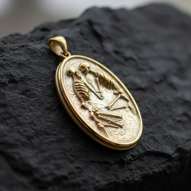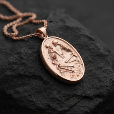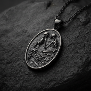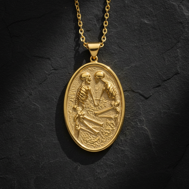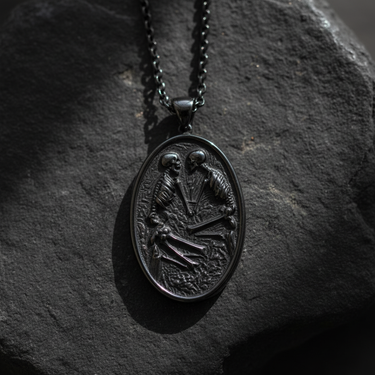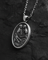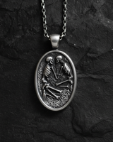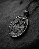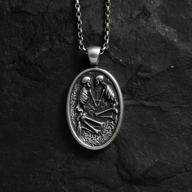 Immortalize your eternal bond with this hauntingly beautiful Silver Skeleton Lovers Pendant, a stunning tribute to love that transcends the boundaries of life itself. Expertly handcrafted from solid 925 sterling silver by skilled artisans, this oval medallion features two skeletons locked in a tender gaze, perfectly capturing the profound sentiment of "Till Death Do Us Part." The intricate high-relief work highlights every rib and bone with precision, while the darkened oxidized background adds dramatic depth and antique character to the scene. This gothic love necklace serves as both a powerful memento mori and a romantic statement piece for those with an alternative style. Whether chosen as a unique anniversary gift or a personal talisman, this silver skeleton lovers pendant combines macabre aesthetics with fine craftsmanship. Durable, hypoallergenic, and timeless, it is an heirloom-quality accessory designed to be cherished for a lifetime.