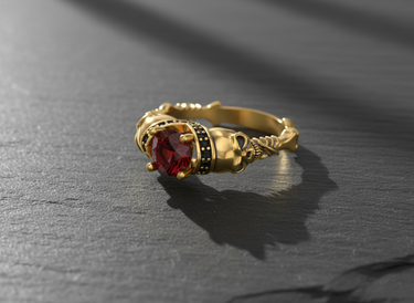 Rose gold plated silver skull engagement ring with red cushion cut gemstone and black accents