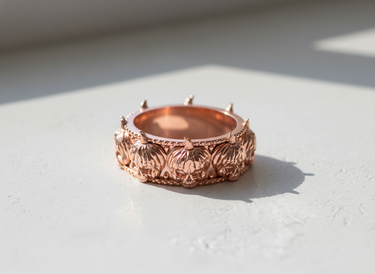 Celebrate the darker side of the season with this intricately designed silver skull pumpkin ring. Meticulously handcrafted by skilled artisans, this unique band features a continuous row of stylized Jack-o'-lanterns that merge pumpkin shapes with menacing skull-like visages for a truly gothic aesthetic. The detailed beaded rims frame the spooky motifs, enhancing the depth and texture of the design. Cast in high-quality 925 sterling silver, this ring boasts exceptional durability and a comfortable fit, ensuring it remains a staple in your collection for years to come. Perfect for Halloween enthusiasts or those who appreciate macabre elegance, this statement piece adds a bold touch to any outfit. Whether you are looking for a conversation starter or a signature accessory, this handcrafted silver skull pumpkin ring symbolizes a perfect blend of festive spirit and timeless craftsmanship.
