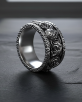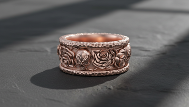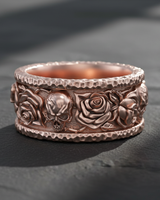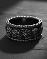 Explore the delicate balance between life and mortality with this striking silver skull rose ring. Expertly handcrafted from high-quality 925 sterling silver, the band features an intricate relief design of alternating skulls and blooming roses, framed by rugged, hammered edges for a forged aesthetic. The dark oxidized finish accentuates the deep contrasts and fine details of the carving, giving the piece a distinct gothic allure and depth. Perfect for bikers, rockers, and those who appreciate memento mori symbolism, this durable ring serves as a bold statement piece or a unique alternative wedding band. Whether bought as a meaningful gift or a personal treat, this sterling silver skull ring combines rugged durability with artistic elegance. Elevate your style with a piece that perfectly captures the beauty of existence and the certainty of fate.