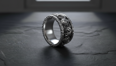 Process: Silver is treated with oxidation to create natural darkening in recessed areas, emphasizing the handcrafted details and giving each piece a vintage, mystical appearance.