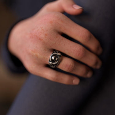 Process: Silver is treated with oxidation to create natural darkening in recessed areas, emphasizing the handcrafted details and giving each piece a vintage, mystical appearance.