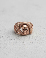 Side angle of gothic sterling silver ring with snake and skull design on textured grey background Side angle of gothic sterling silver ring with snake and skull design on textured grey background