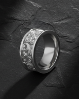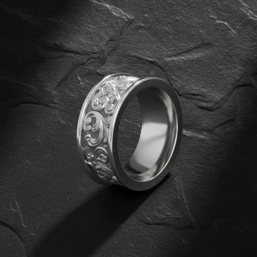 Elevate your personal style with the timeless elegance of this handcrafted silver baroque scroll ring. Masterfully forged from premium 925 sterling silver, this wide band features an intricate acanthus leaf pattern inspired by the opulent art and architecture of the Baroque era. The deep relief carving is expertly accentuated by a dark oxidized background, creating a striking contrast against the polished raised scrolls and smooth, structural borders. The interior of the ring is thoughtfully designed for a comfortable fit, making it perfect for daily wear as a sophisticated statement piece or as a unique alternative wedding band. Whether you are seeking a distinctive gift for him or a classic addition to your own jewelry collection, this silver baroque scroll ring offers unmatched durability and artistic flair. Experience the perfect blend of vintage charm and modern craftsmanship with this exquisite ornamental jewelry piece that transcends fleeting trends.