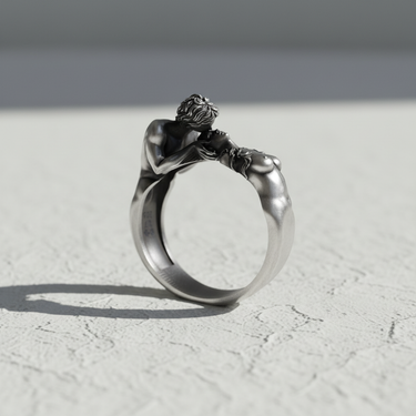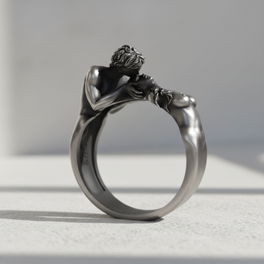 Experience timeless romance captured in precious metal with this extraordinary sculptural ring. Crafted from genuine 925 sterling silver, this artistic masterpiece depicts two lovers locked in an eternal embrace, their bodies gracefully intertwined to form a powerful symbol of devotion and passion. Each intricate detail celebrates the beauty of human connection, from the flowing hair to the tender gesture of their kiss. The oxidized finish accentuates every curve and contour, creating dramatic depth that brings this miniature sculpture to life. More than jewelry, this ring tells a love story that transcends time. Perfect for romantics, art collectors, and those who believe in the power of eternal love. An exceptional gift for anniversaries, weddings, or anyone who cherishes meaningful jewelry with soul.