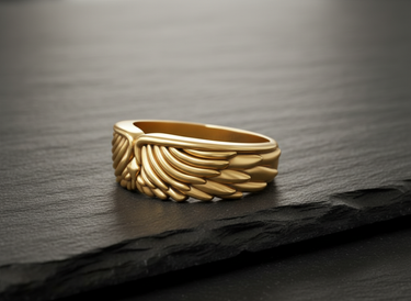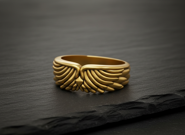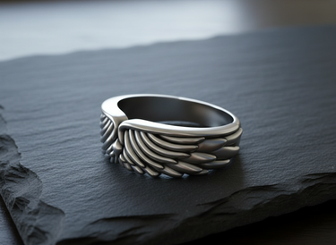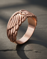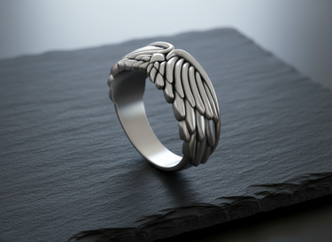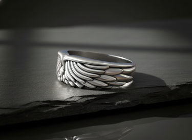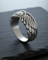 Side angle of silver angel wing ring showing band thickness and intricate feather texture suitable for men and women Side angle of silver angel wing ring showing band thickness and intricate feather texture suitable for men and women