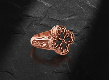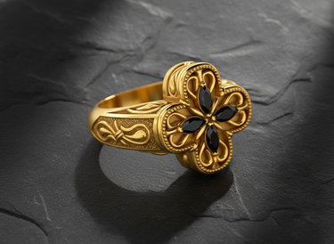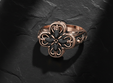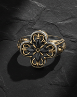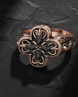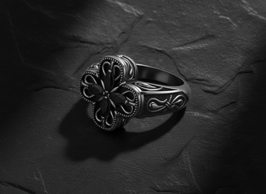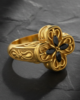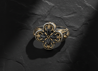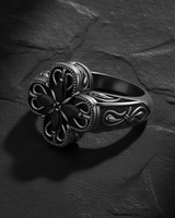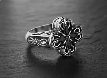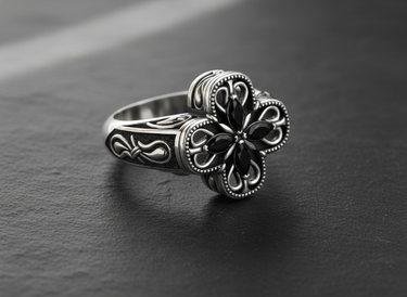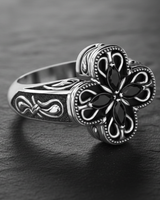 Discover divine elegance with this handcrafted silver cross ring featuring an ornate quatrefoil design. Each petal showcases stunning black marquise gemstones arranged in a floral pattern, framed by delicate beaded borders that catch the light beautifully. Crafted from premium 925 sterling silver, this cross ring combines sacred symbolism with sophisticated artistry. The ornate scrollwork band adds vintage charm while ensuring comfortable daily wear. Perfect for expressing faith or gifting to loved ones, this religious jewelry piece transitions seamlessly from casual to formal occasions. The oxidized finish enhances every intricate detail, creating depth and character that makes this cross ring a treasured statement piece for years to come.