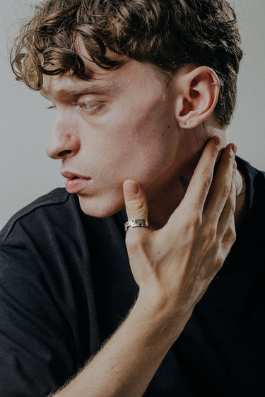 Be gentle when cleaning oxidized pieces. The dark patina is intentional and adds character. Light cleaning with the care cloth will maintain the contrast between oxidized and polished areas.