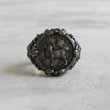 Carry a profound symbol of faith with our handcrafted Silver Agnus Dei Ring, a powerful testament to sacrifice and redemption. This exceptional piece features the Lamb of God, meticulously detailed with a halo and the banner of victory. The bezel is inscribed with the sacred Latin phrase "Ecce Agnus Dei, qui tollit peccata mundi." Expertly cast in solid 925 sterling silver, the ring showcases an oxidized finish that accentuates every intricate detail, from the central motif to the Chi-Rho symbols adorning the sides. This substantial signet ring is more than jewelry; it is a wearable piece of art and a declaration of belief. Ideal for daily wear or as a meaningful gift, this Silver Agnus Dei Ring blends timeless Christian symbolism with superior craftsmanship for a piece to be treasured for a lifetime.