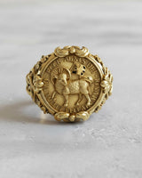 Angled view of the sterling silver Agnus Dei ring showcasing the intricate Chi-Rho symbol on the side band and ornate shoulder details. Angled view of the sterling silver Agnus Dei ring showcasing the intricate Chi-Rho symbol on the side band and ornate shoulder details.