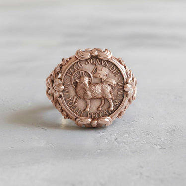 Front view of the Silver Agnus Dei Ring featuring the Lamb of God and the 'Ecce Agnus Dei' Latin inscription on an oxidized background. Front view of the Silver Agnus Dei Ring featuring the Lamb of God and the 'Ecce Agnus Dei' Latin inscription on an oxidized background.