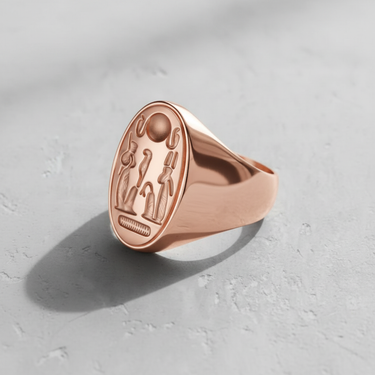 Side view of 925 sterling silver Akhenaten ring with matte finish and deep engraved hieroglyphic details Side view of 925 sterling silver Akhenaten ring with matte finish and deep engraved hieroglyphic details