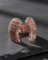 14K gold vermeil angel wing ring with textured feathers displayed on dark slate background 14K gold vermeil angel wing ring with textured feathers displayed on dark slate background