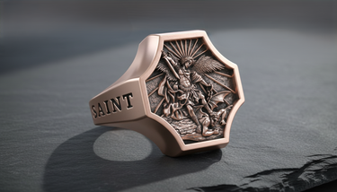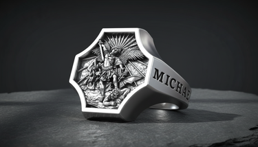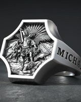 Detailed 925 sterling silver Archangel Michael ring featuring St Michael defeating Satan relief on black textured surface Detailed 925 sterling silver Archangel Michael ring featuring St Michael defeating Satan relief on black textured surface