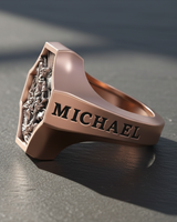 Gold plated version of Archangel Michael signet ring displaying high relief sword and demon imagery on dark stone background Gold plated version of Archangel Michael signet ring displaying high relief sword and demon imagery on dark stone background