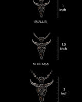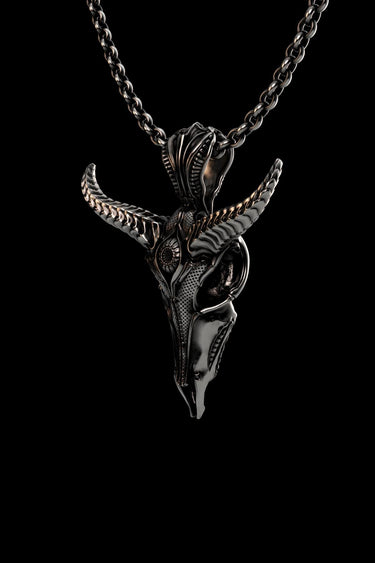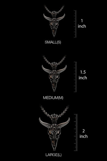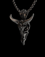 Unleash your mystical side with this striking Baphomet skull pendant crafted from premium 925 sterling silver. This gothic masterpiece features intricately detailed horns with textured surfaces, a central mystical eye symbol, and elaborate ornamental patterns that showcase exceptional artistry. The oxidized finish enhances every carved detail, creating dramatic depth and shadow that brings this occult-inspired design to life. Each silver Baphomet pendant is meticulously handcrafted by skilled artisans, ensuring superior quality and durability. Perfect for those drawn to alternative spirituality, gothic fashion, or mystical symbolism, this statement pendant makes an unforgettable addition to any jewelry collection. Whether worn for ritual purposes or as a bold fashion statement, this Baphomet skull pendant commands attention and reflects your unique spiritual journey.