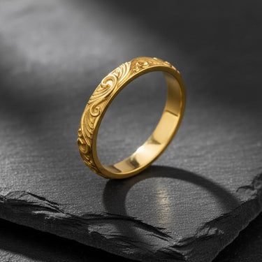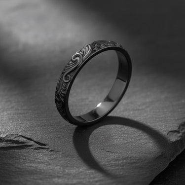 Discover timeless elegance with our handcrafted Carved Silver Wedding Band, a symbol of enduring love and commitment. This exquisite ring features a continuous, deep-carved pattern of swirling leaves and vines that encircles the entire band. The intricate botanical design is brought to life by a dark oxidized finish, which adds remarkable depth and contrast, highlighting every delicate detail. Expertly forged from solid 925 sterling silver, the ring offers both a substantial feel and exceptional durability for daily wear. Our artisans meticulously craft each piece, blending vintage-inspired aesthetics with modern sophistication. Perfect for nuptials, as a distinctive anniversary gift, or a stylish statement ring, this piece celebrates nature's artistry. Embrace a symbol as unique and meaningful as your bond.