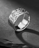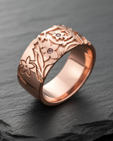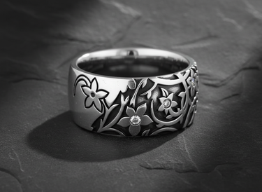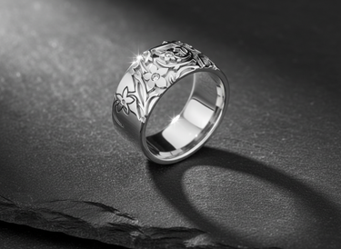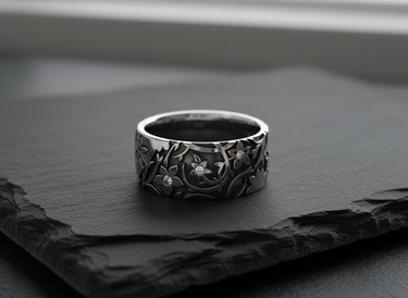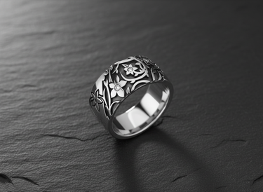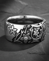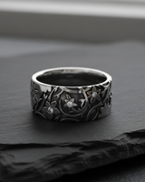 Discover the enchanting beauty of this handcrafted silver floral ring, featuring an intricate botanical pattern that wraps elegantly around a wide band. Each delicate flower and flowing vine is meticulously carved into premium 925 sterling silver, with sparkling gemstone accents that catch the light beautifully. The sophisticated floral motifs create a stunning three-dimensional effect, showcasing exceptional artisan craftsmanship and attention to detail. This sterling silver floral ring perfectly balances feminine elegance with contemporary style, making it ideal for nature lovers and those who appreciate unique botanical jewelry. Whether worn as a statement piece for special occasions or as an everyday luxury accessory, this floral ring adds timeless sophistication to any ensemble with its garden-inspired design.