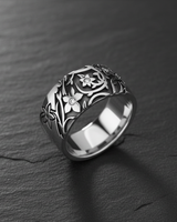 Process: Silver is treated with oxidation to create natural darkening in recessed areas, emphasizing the handcrafted details and giving each piece a vintage, mystical appearance.