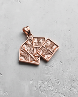 Silver Four Kings Pendant with four detailed playing cards fanned out, shown on a textured light gray surface. Silver Four Kings Pendant with four detailed playing cards fanned out, shown on a textured light gray surface.